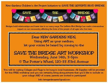 The Potter’s Wheel, located at 120-33 83rd Ave., Kew Gardens, is holding a free event tomorrow from 3 p.m. to 5 p.m., where kids are invited to use art as their medium, and make collages and flags in support of keeping the bridge that will be displayed in local businesses.