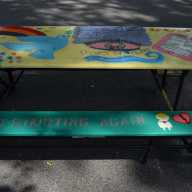 Over 60 students from the middle school participated in the Learning through an Expanded Arts Program‘s (LEAP) “A View From the Lunchroom Students Bringing Issues to the Table” art exhibit where they painted a lunchroom table with inspiring pictures and messages outlining the two community issues that they felt needed to be addressed. That table is now proudly displayed at Benninger Playground, and will remain there through August.