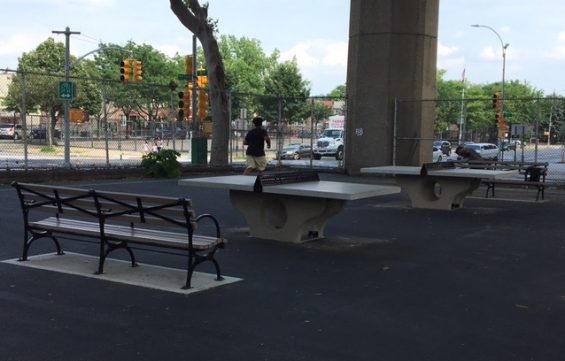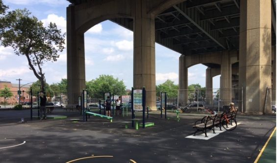 A playground located under the Triborough Bridge has been revamped and now features ping pong tables, volleyball courts, exercise equipment and painted exercise games.