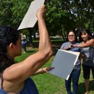 The group had with them a cereal box outfitted with aluminum foil and a sheet of paper to watch as the moon passed the sun; two pieces of cardboard with holes punched through the center that they held up so the eclipse would cast a shadow on the cardboard; glass from a picture frame that was held over a flame to create an almost smokescreen effect on the glass; and even glass from a welder’s mask.
