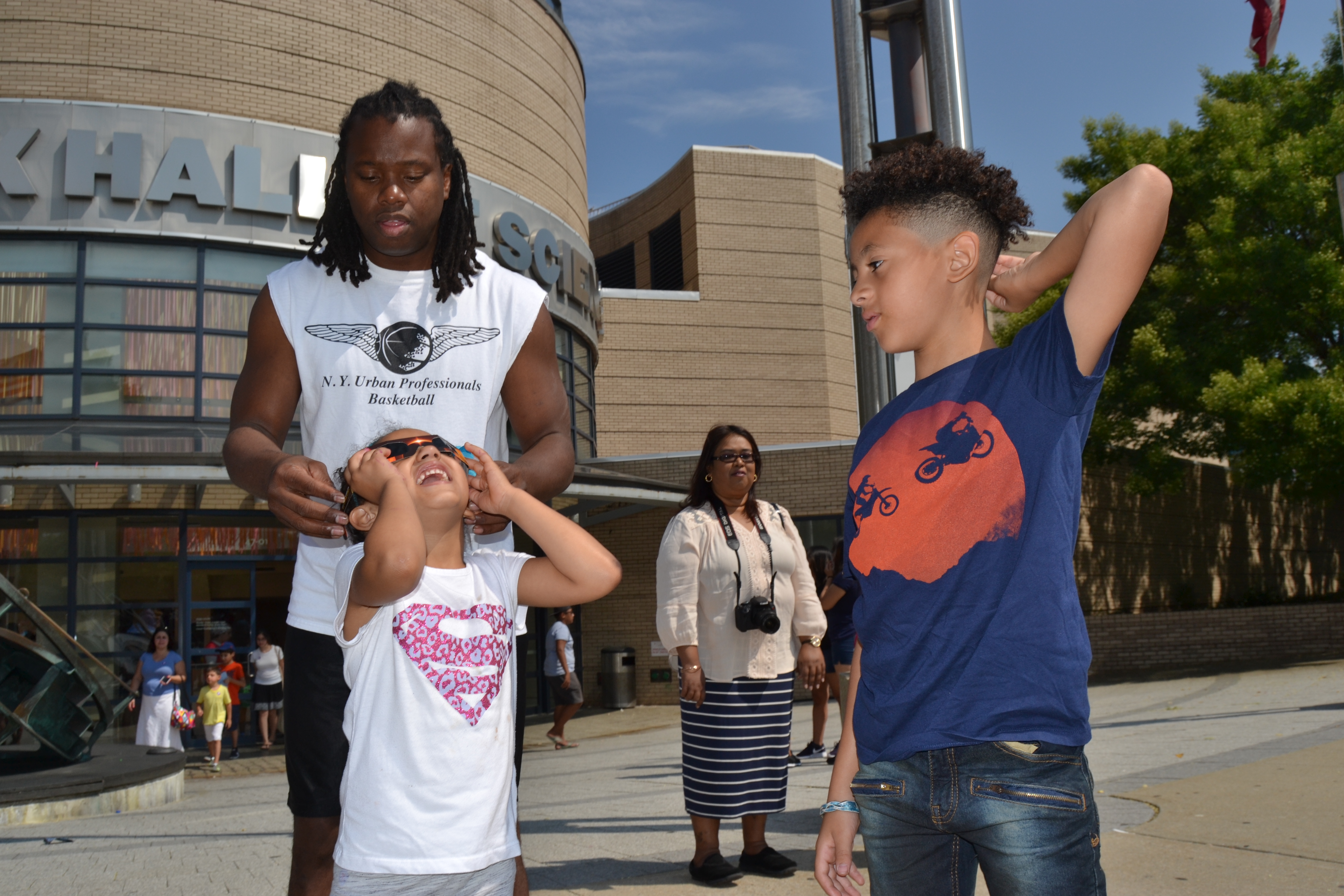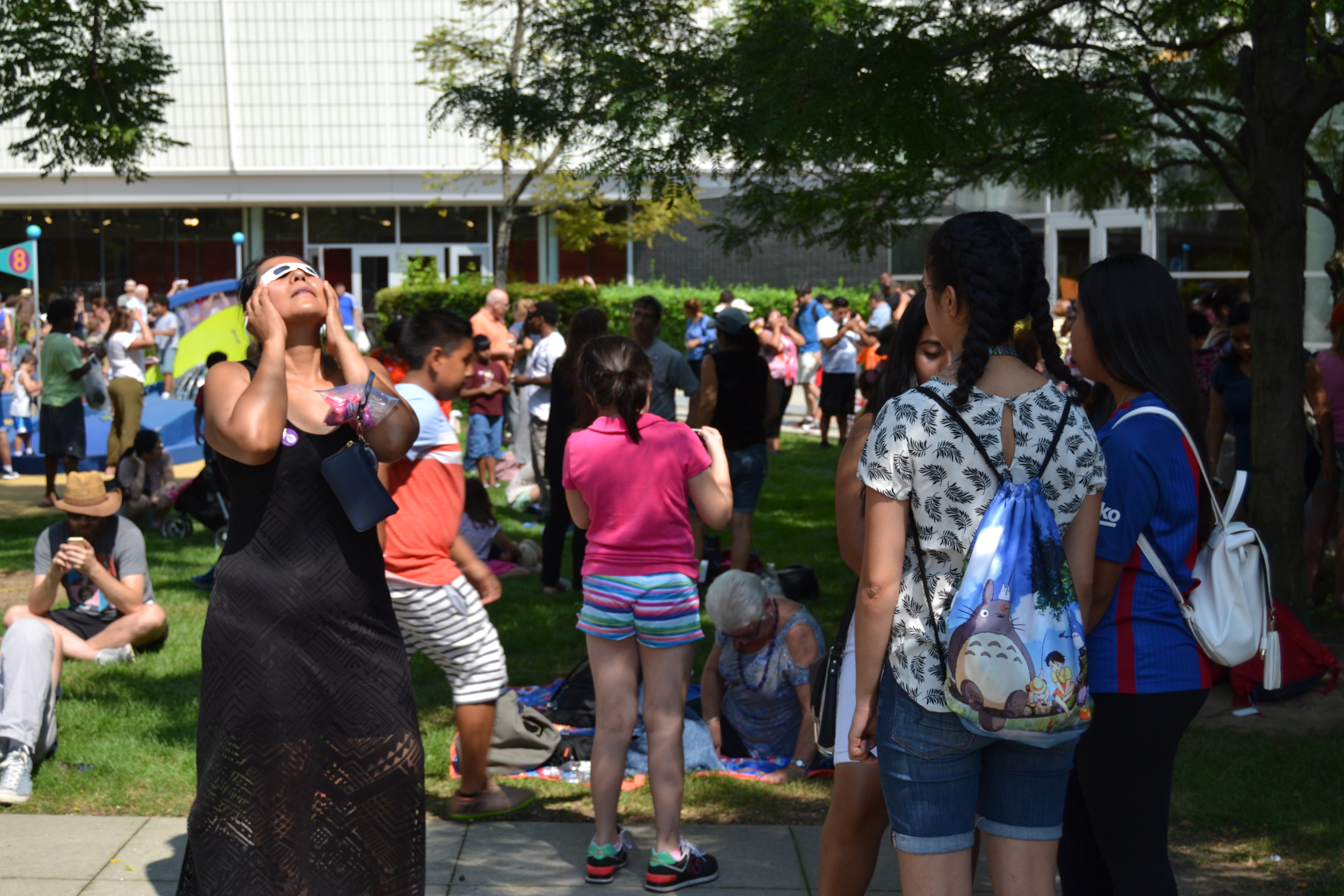 People of all ages gathered at the Hall of Science, either inside the museum or on the front lawn, equipped with all kinds of devices to view the moon passing in front of the sun, which casts a shadow on the Earth.