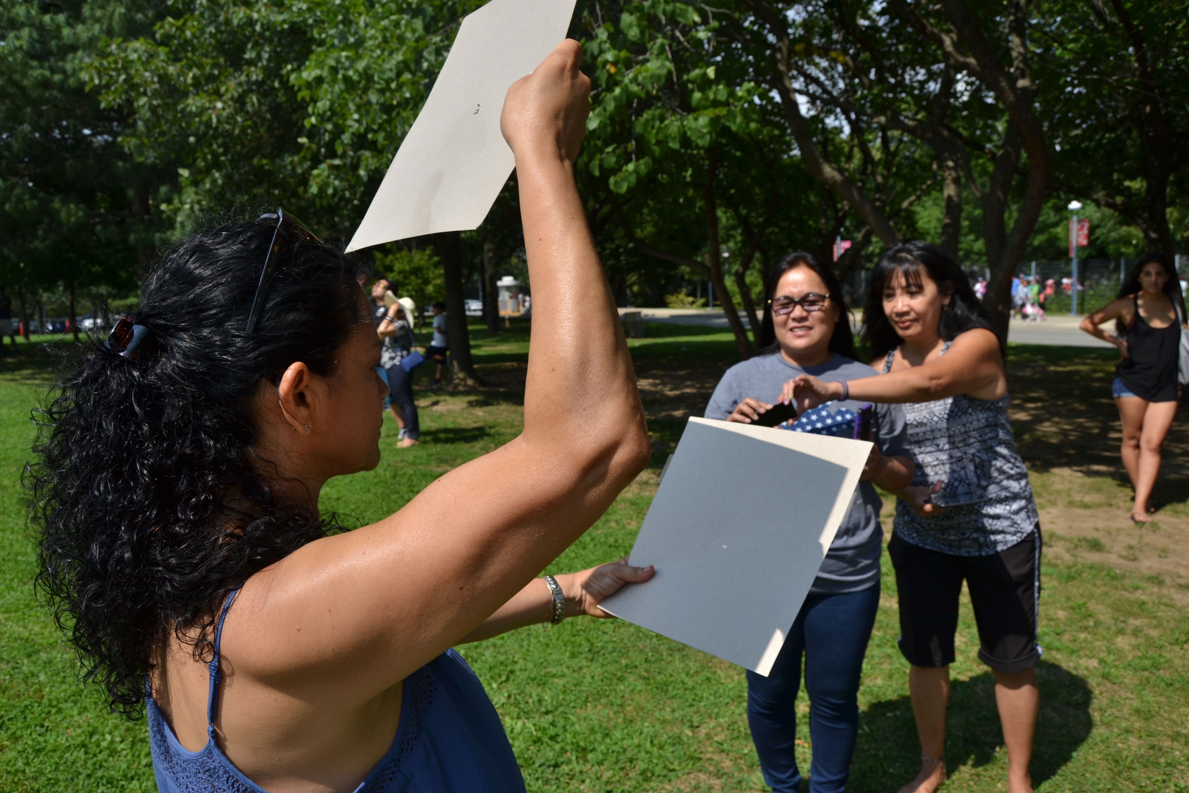 Carolina Scaturro, Matthew Scaturro, and Gloria Villa came from Franklin Square to get a glimpse of the eclipse because they are members at the Hall of Science. They came prepared with sheets of X-ray paper which allowed them to look up at the sun without hurting their eyes.