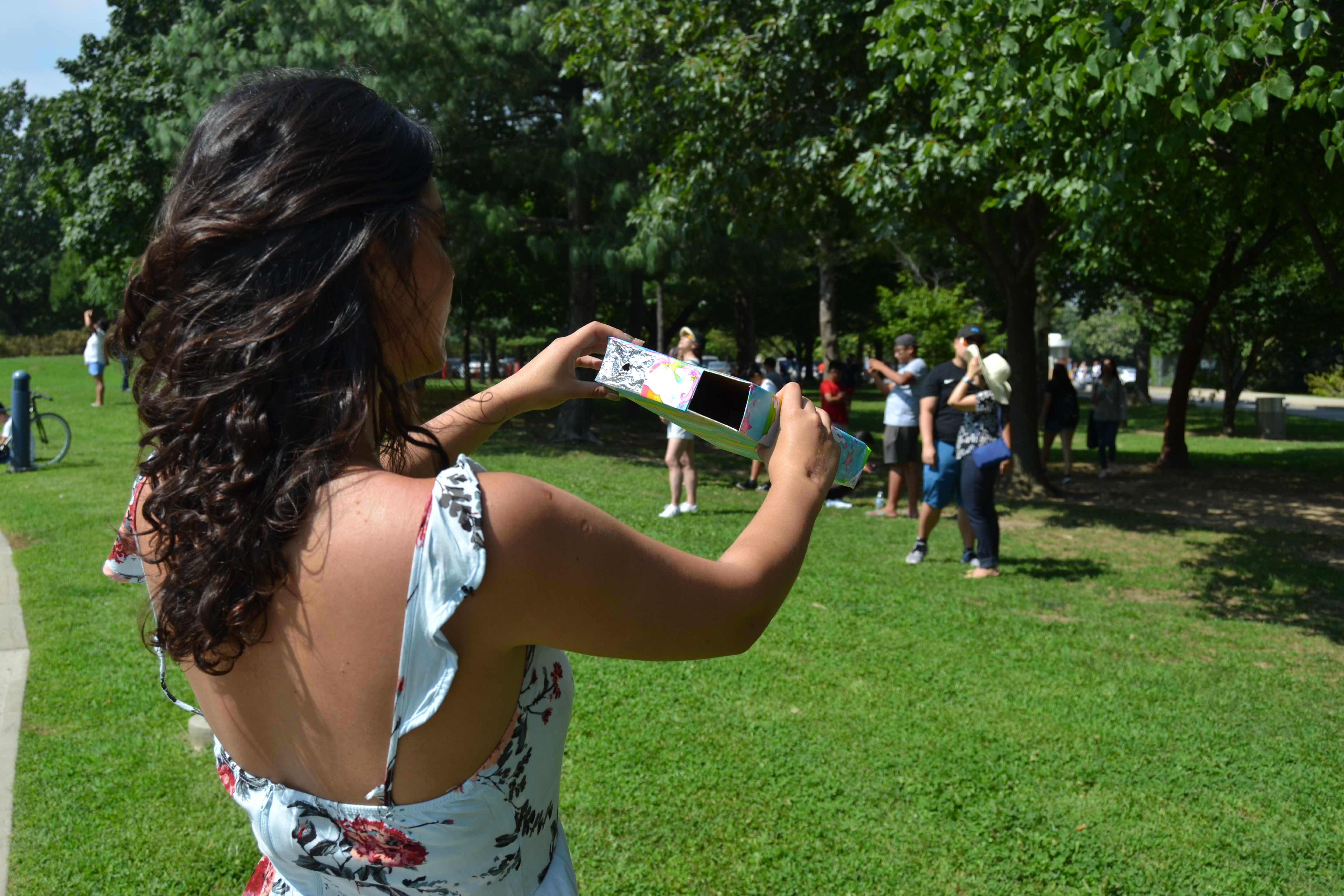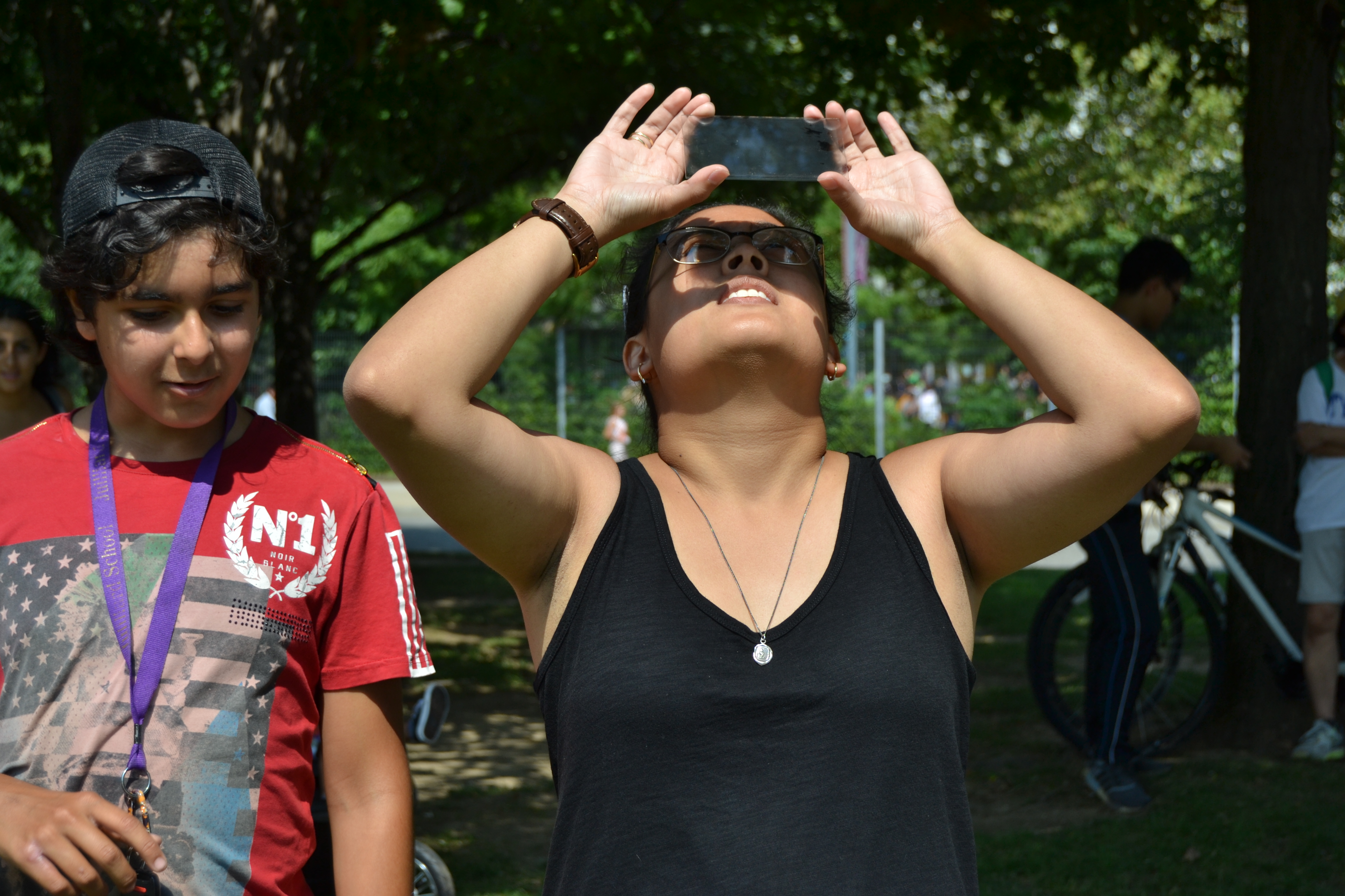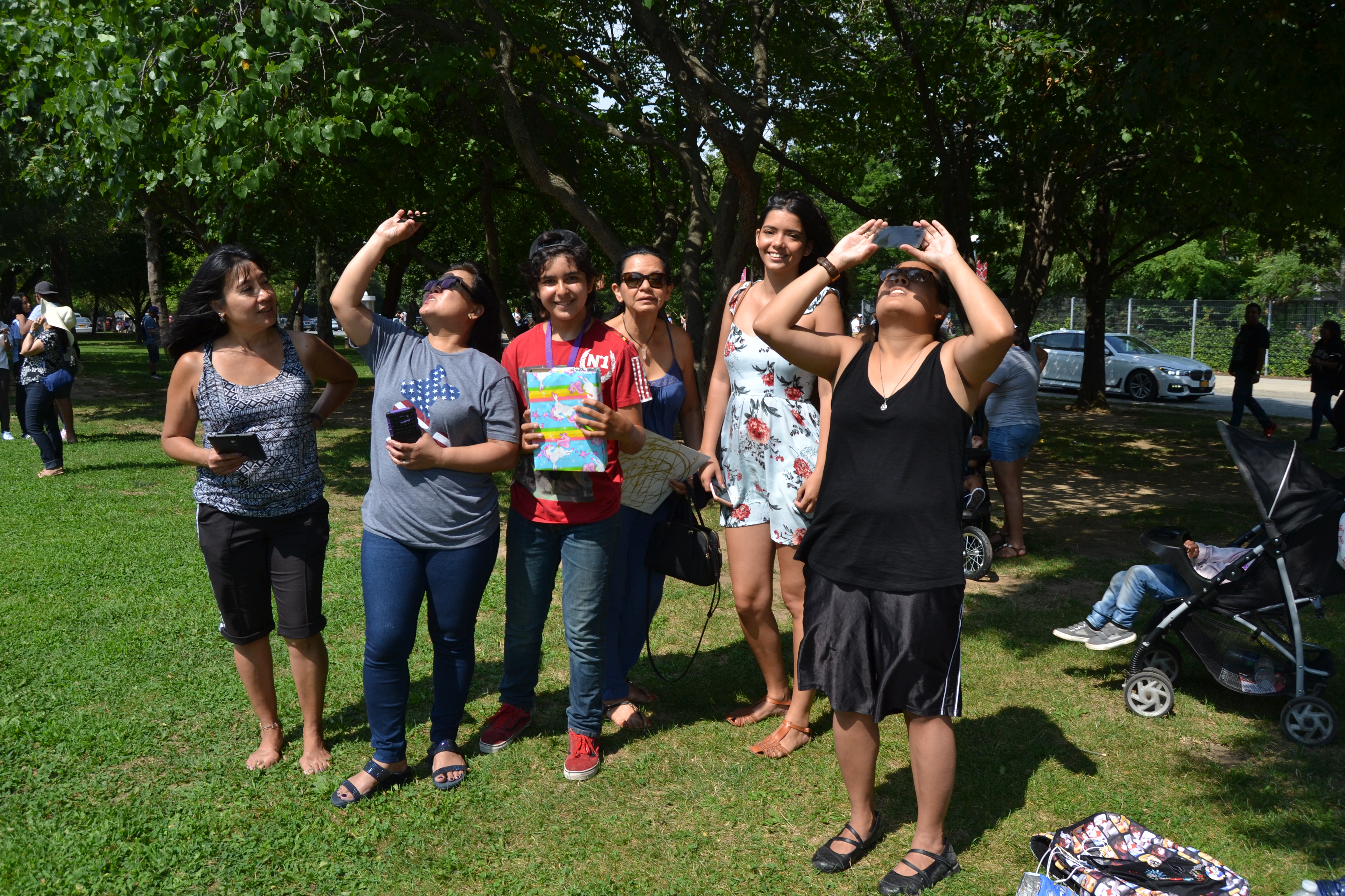 Giann Cortes, Violetta Ochoa, Angelina Beltran, Giulianna Barbero, and Zoila Caceres came from Elmhurst and Corona with an arsenal of devices to watch the eclipse.