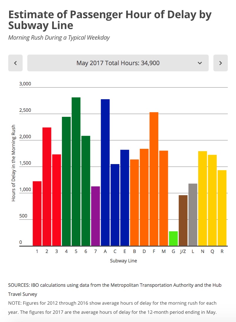 New infographics from the city’s Independent Budget Office detailing how much time subway commuters lost to delays from 2012 to 2017 per line reveal that 7 train riders lost a combined total of over 1,100 hours this year.
