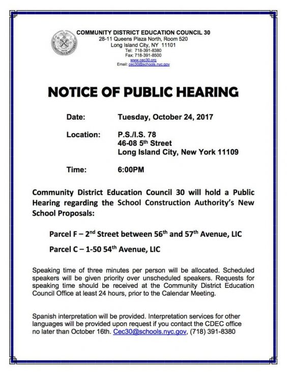 The meeting, organized by Community District Education Council 30, will take place Oct. 24 at 6:00 p.m., and will be located at I.S. 78 at 46-08 5th St. The public, allotted a speaking time of three minutes per person and with a preference for scheduled speakers, will be able to give feedback to the district on the two schools to be built on parcel C and parcel F of the the remaining massive waterfront development.