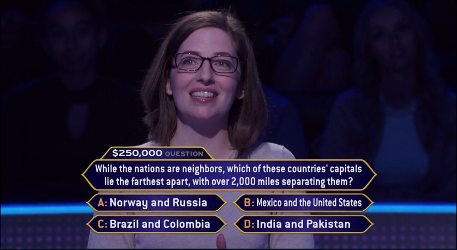 Liz Farley, 38, was just three questions shy from winning the top prize of $1 million on the syndicated show, which aired at 2 pm on Oct. 27, when she walked away. The question, which would have moved her to $250,000, required Farley to pick which countries’ capitals lay the farthest apart out of four possible answers.