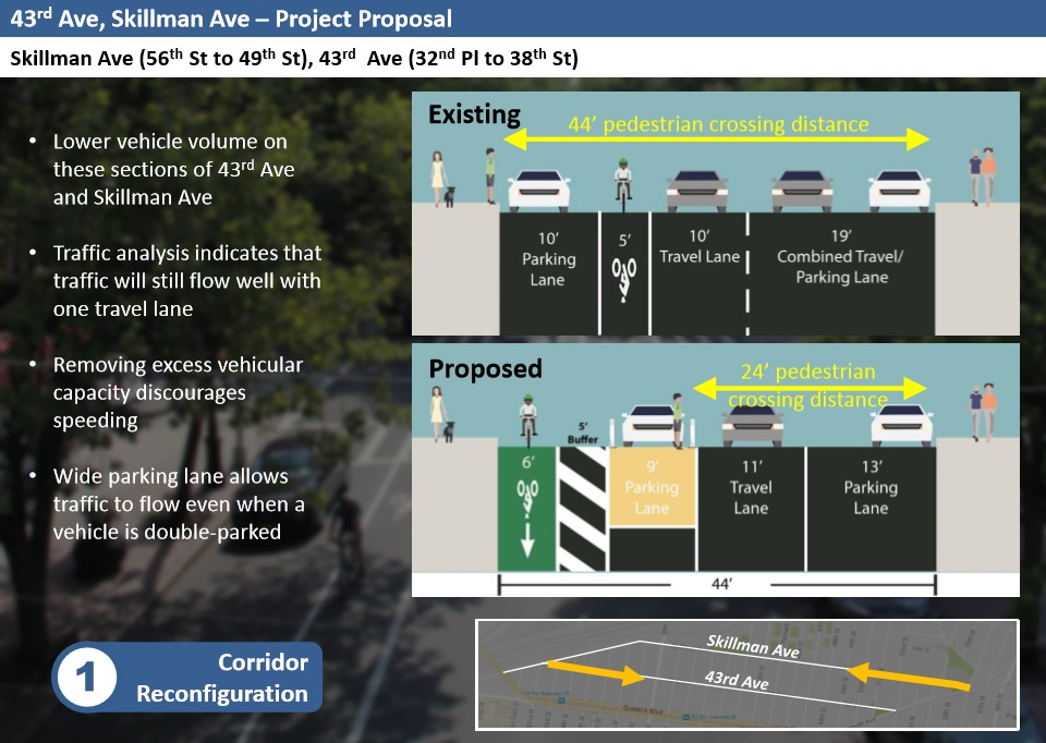 The DOT proposal calls for one lane to be scrapped on Skillman Avenue from 49th Street to 56th Street.
