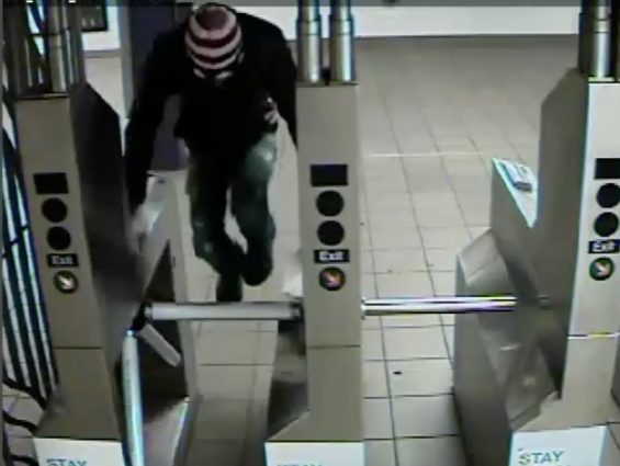 The suspect, seen jumping a turnstile in the attached video released by the NYPD, is described as an Asian/Pacific Islander, between 20 to 25 years old, either 5’5” or 5’6”, and weighing 150 pounds. He was last seen wearing a red, white and blue winter hat, a black leather jacket, and blue jeans.