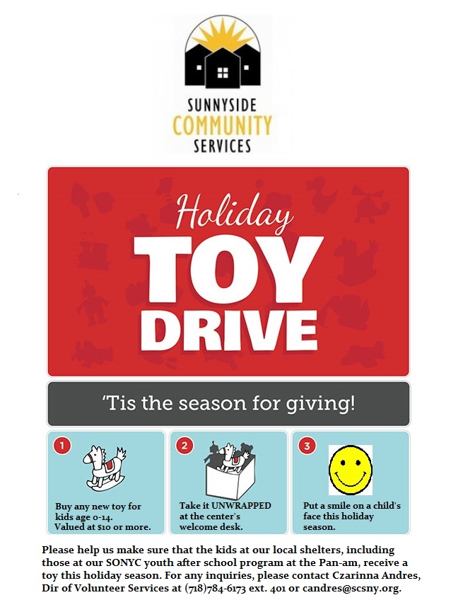 To participate, SCS encourages new toys, valued at $10 or more, to be bought for kids up to the age of 14. The toy should then be delivered unwrapped to the center’s welcome desk at 43-31 39th St.