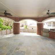 - A backyard patio complete with blue stone tiles and a barbecue setup