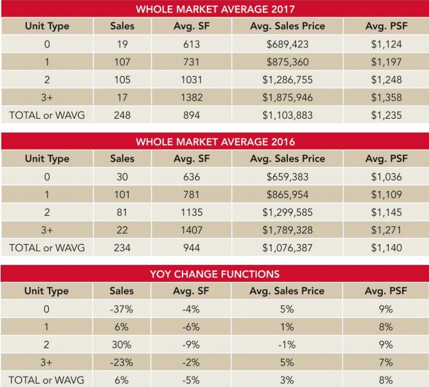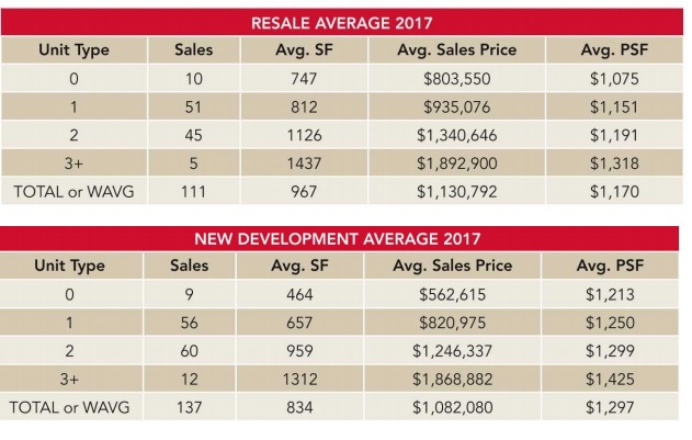 The average price paid for a condo in 2017 was $1,104,000, up 3 percent from 2016. The increase came despite the average unit size sold dropping from 944 square feet in 2016 to 894 square feet in 2016.