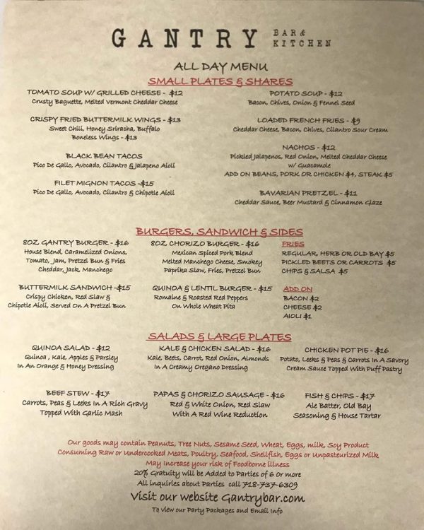 Gantry Bar & Kitchen, located on 47-02 Vernon Blvd., opened in February 2016 offering quality food in addition to a wide selection of draft beer.