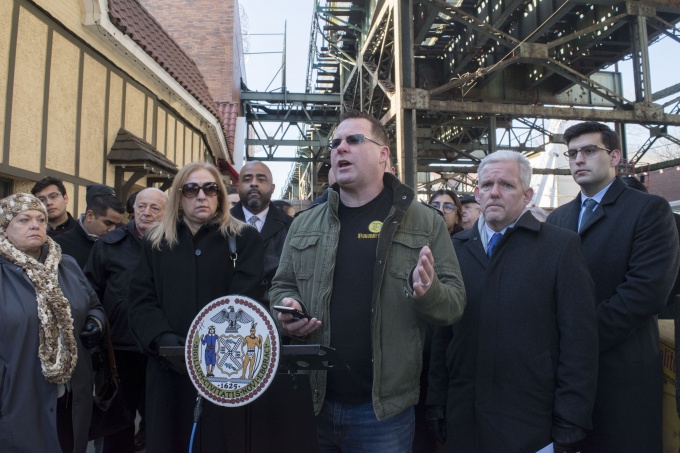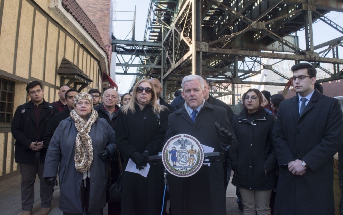 “We need safe, reliable transit,” said Councilmember Jimmy Van Bramer (D-Woodside) outside Donavan’s Pub at the corner of 58th Street and Roosevelt Avenue. “But you can’t destroy a neighborhood in the process of saving a train line.”