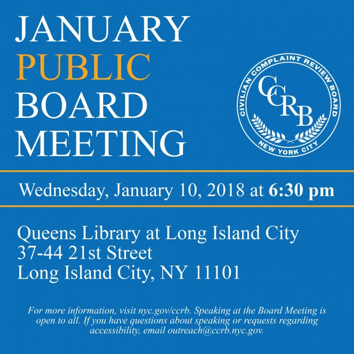 The community board meeting, organized every month by the Civilian Complaint Review Board (CCRB), will be held on Jan. 10 at the Long Island City Library, located at 37-44 21st St. The meeting will begin at 6:30 p.m.