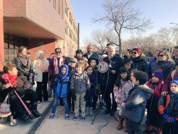 “These streets, especially crossing Skillman Avenue, are a crash waiting to happen,” Van Bramer said outside the school’s main entrance this afternoon. “We cannot wait for a child to be injured or lose their life before we act.”
