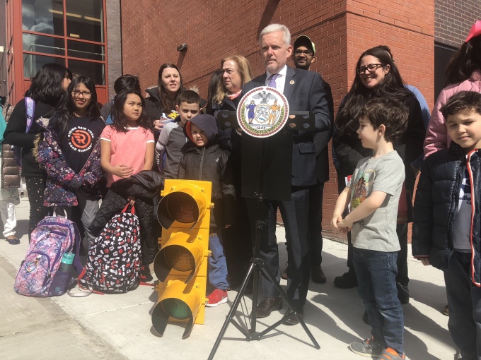 Councilmember Jimmy Van Bramer (D-Sunnyside) at a press conference announcing new traffic lights for P.S. 11.