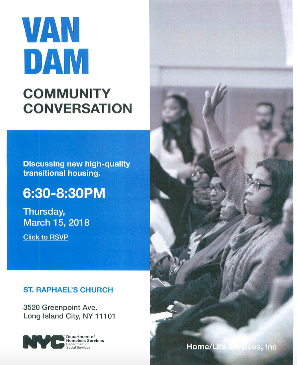 The meeting will be held on March 15 at St. Raphael’s Church, located at 35-20 Greenpoint Ave., from 6:30 p.m. to 8:30 p.m. The event, organized by the Department of Homeless Services, will deal with the permanent homeless shelter for adult families at 52-34 Van Dam St. expected to open this month.