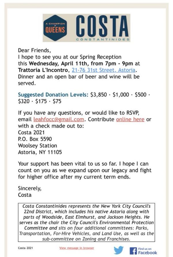 The invitation to the fundraiser reads: “Costa Constantinides a Champion for Queens,” and adds, “I hope I can count on you as we expand upon our legacy and fight for higher office after my current term ends.”