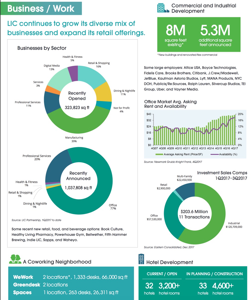 “This year’s Neighborhood Snapshot perfectly captures our dynamic, mixed-use, live/work community that’s coming into focus,” said Elizabeth Lusskin, president of the LIC Partnership. “While previous Snapshots showed rises in individual sectors, this report revealed tremendous growth across all sectors in Long Island City. We anticipate even greater demand for space in LIC now that Cornell Tech is open and as the life sciences initiatives of the City and State take shape.”