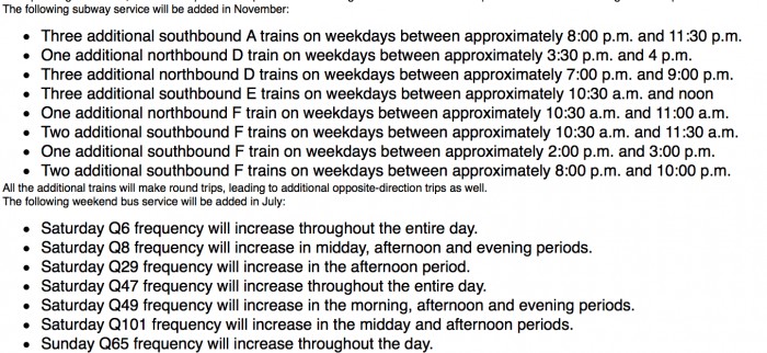 The MTA announced today that it will expand A, D, E and F train service on weekdays and add buses to several Queens lines on weekends.