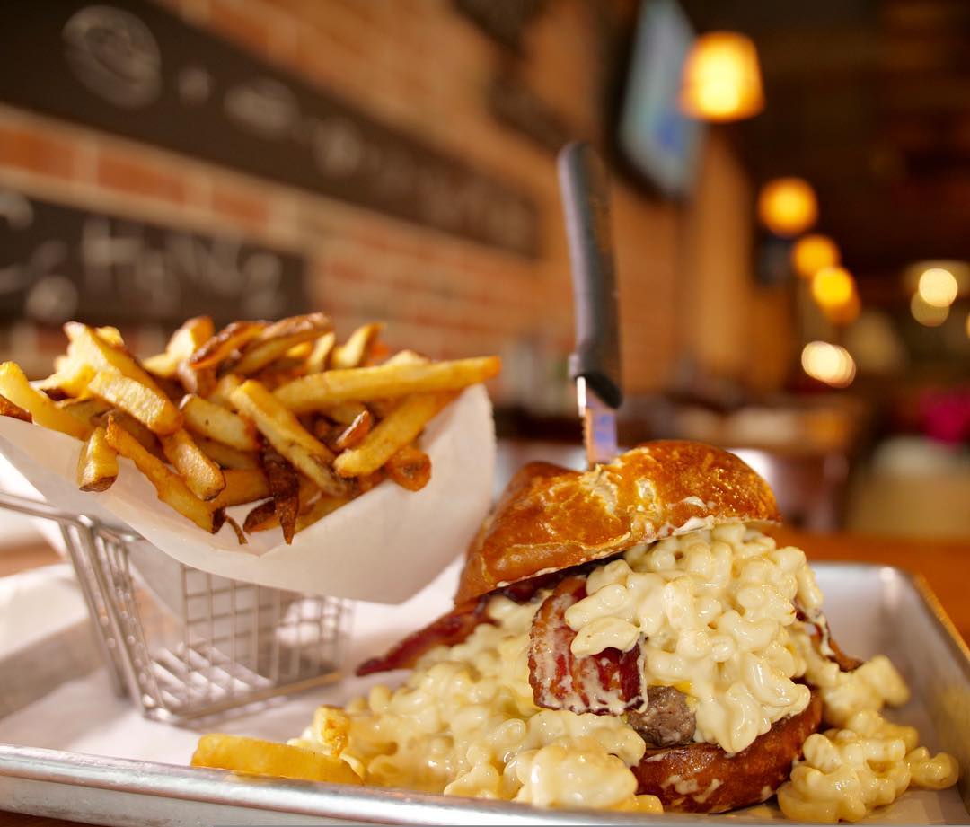 These include the “mac attack” burger— a burger topped with mac and cheese, cheese sauce and served on a pretzel bun.