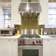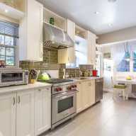 The first floor boasts an eat-in kitchen with high-end appliances, custom cabinetry and Caesarstone counters.