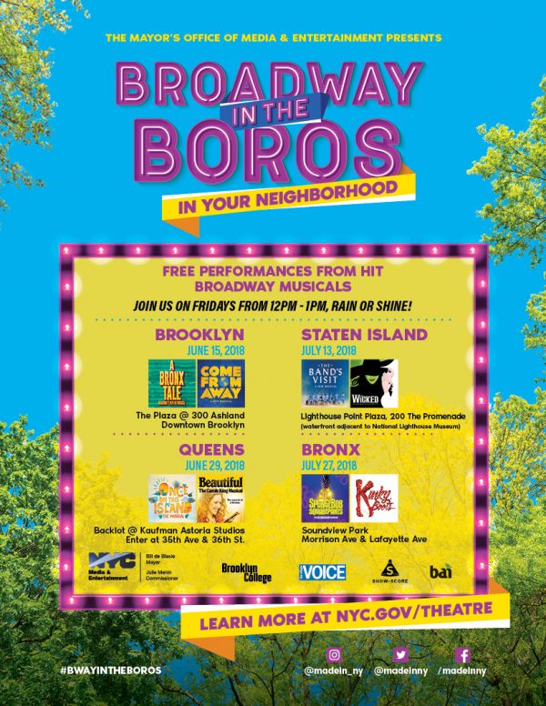 The following Friday, June 29, the “Broadway in the Boros” performance series will take place showcasing some of Broadway’s latest talent in a special free performance. The show lasts an hour, going from 12 p.m. to 1 p.m., rain or shine.