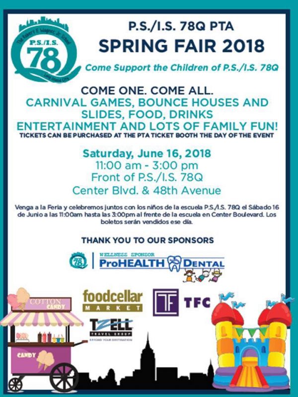The P.S./ IS 78Q PTA is holding its annual fair between 11 a.m. and 3 p.m. at Center Boulevard and 48th Avenue that will feature food, drink and games. The event is a fundraiser to help the school. Tickets can be purchased at the PTA ticket booth at the event.
