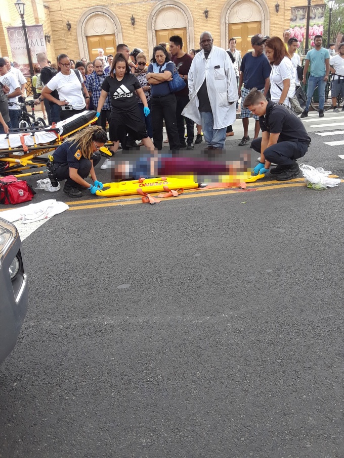 Photos and video posted to social media show an ambulance and other FDNY and NYPD cars at the intersection, directly in front of Saint Sebastian Roman Catholic Church. In one photo posted to Facebook by Kevin Moran, one of the victims appears to be laying on the ground as responding personnel prepare to carry her into a stretcher.