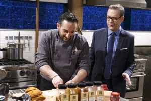 Host Ted Allen checks in on chef Nicholas Poulmentis (Photo: Courtesy of Food Network)