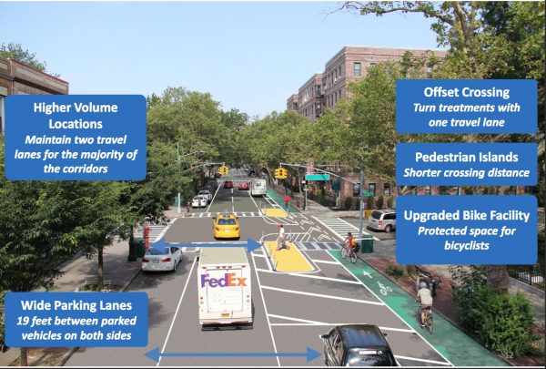 The street safety improvement project, which went through three iterations and continues to be the subject of much controversy in Sunnyside, includes the installation of protected bike lanes, pedestrian islands, some travel lane losses, and the elimination of a combined 116 parking spaces through a roughly 25 block section of the avenues.