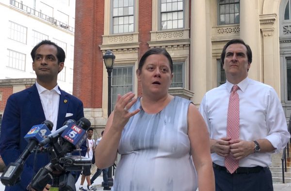 Julie Schwietert Collazo, center, leading a press conference on Monday before Yeni Gonzalez Garcia’s arrival. (Photo: Nathaly Pesantez)