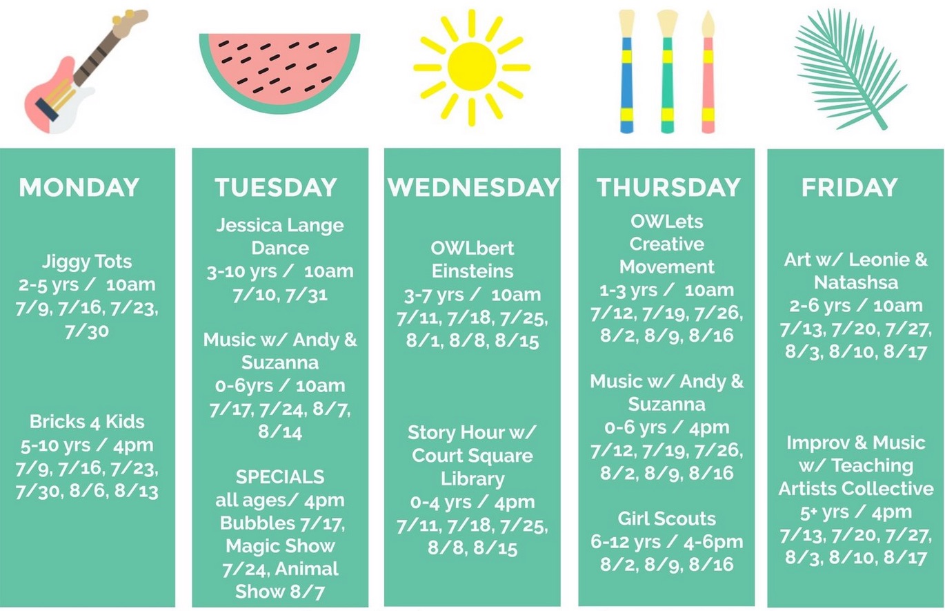 Other activities include Music with Andy & Suzanna, a pair of Long Island City-based musicians; OWLbert Einsteins led by instructors from City Owlets, the local LIC playcafe; and a magic and live animal show.