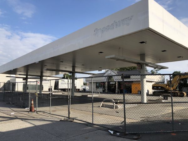 The gas station at 39-04 Northern Blvd. is surrounded by perimeter fencing with the site left bare save for the overhead metal canopy bearing remnants of the Speedway logo, and a building that housed a small convenience store and a Dunkin’ Donuts.