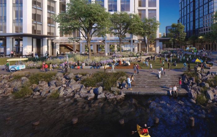 The open space, like other details of the project, are still being worked out. The inlet heading toward the former Water’s Edge Restaurant space, for example, will have some vehicular access, but is mainly intended to be a shared pedestrian and cyclist space.