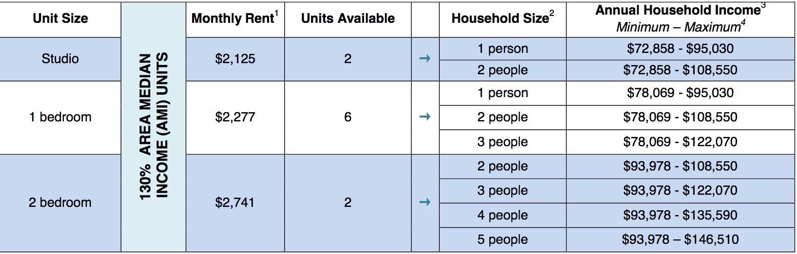 The remaining two-bedroom units go for $2,741 for household sizes between two and five people. An annual household income starting at $93,978 is required to qualify.