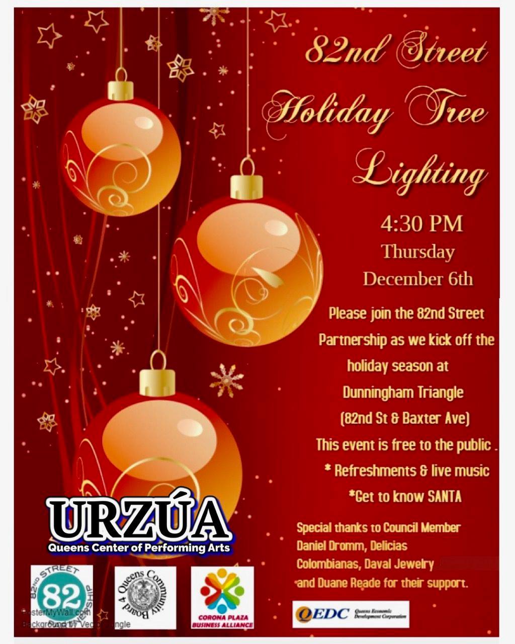 The tree lighting will feature a performance by the Urzua Queens Choir, a local performing arts school dedicated to the spread of the creative arts in Queens, as well as hot chocolate and a visit from Santa.