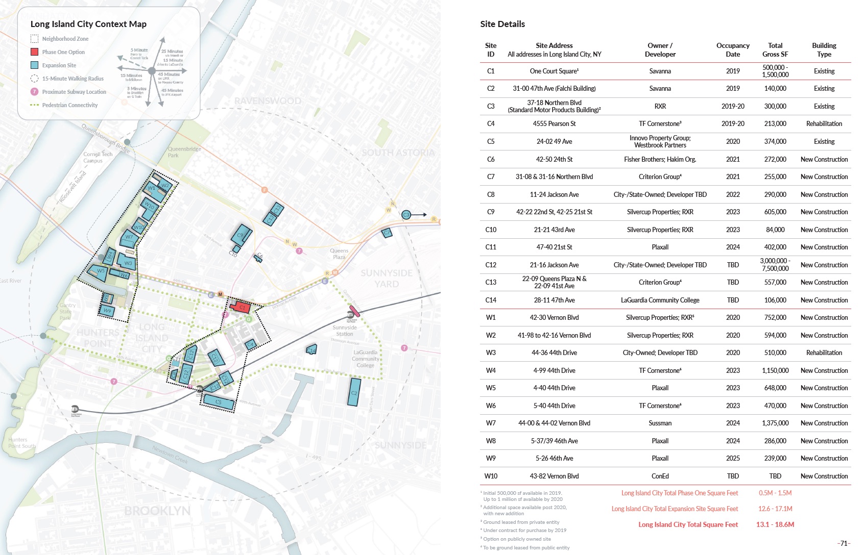 The sites included practically all waterfront properties west of Vernon Boulevard between Queens West and the Queensborough Bridge, along with a cluster of sites in Court Square south of Jackson Avenue. Some properties, additionally, were identified in Queens Plaza and scattered areas north and south of Sunnyside Yard.