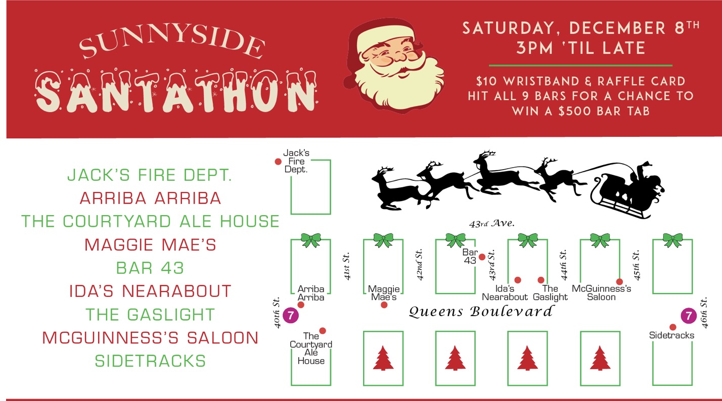 Map and list of participating Santathon establishments. (Sunnyside’s Boulevard Bars)