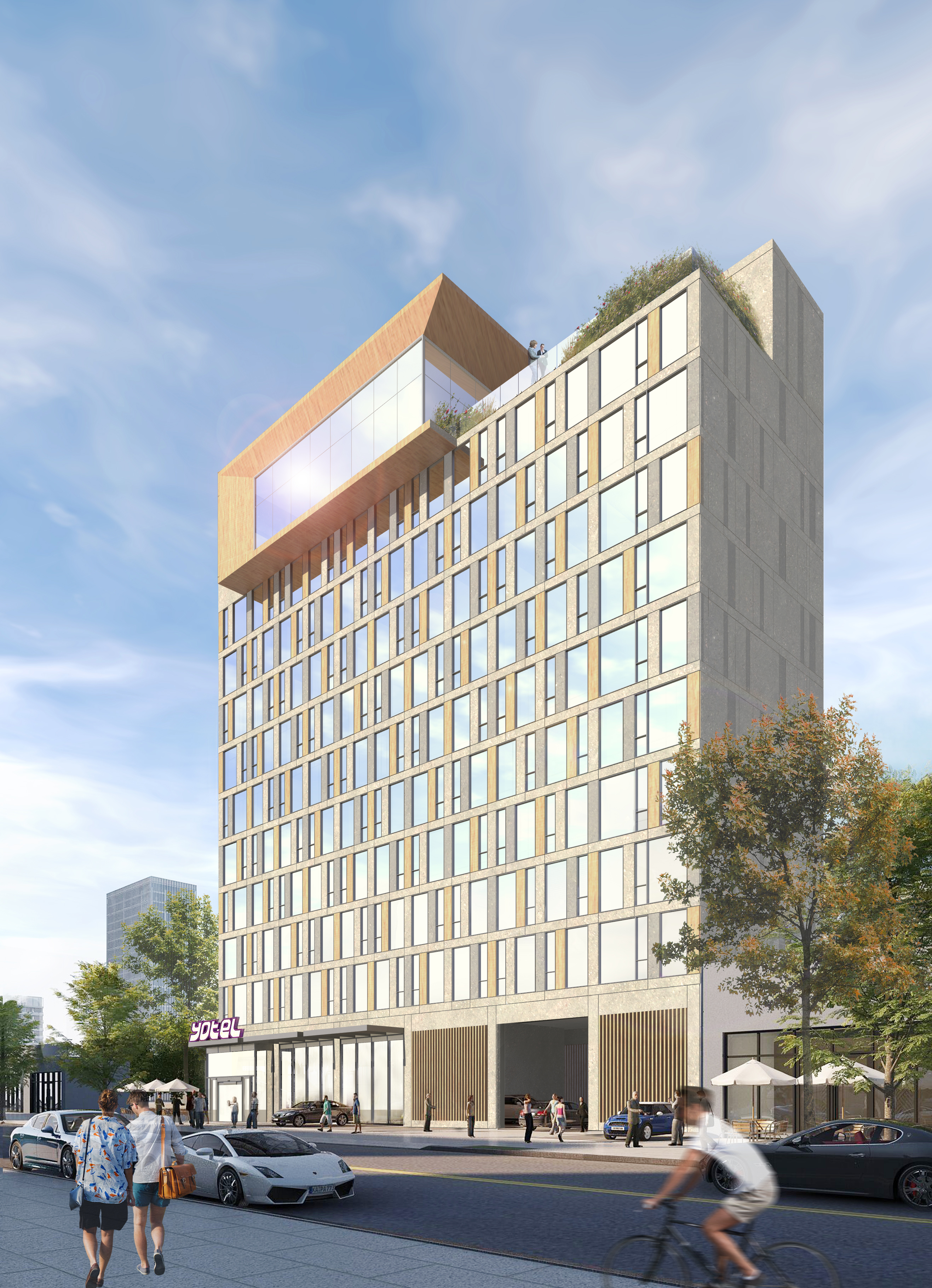 The hotel will have co-working and meeting spaces, a gym, and an indoor and outdoor rooftop terrace and bar. A little over 20 enclosed parking spaces will be provided.