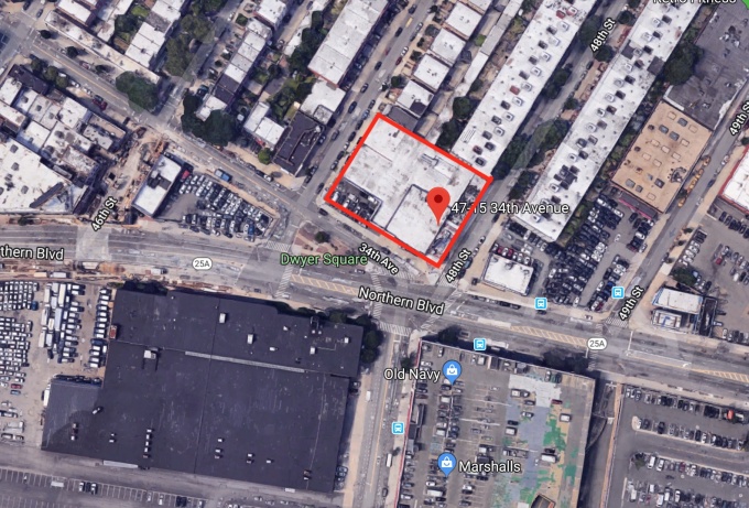 47-15 34th Ave., the development site, outlined in red. (Google Maps)