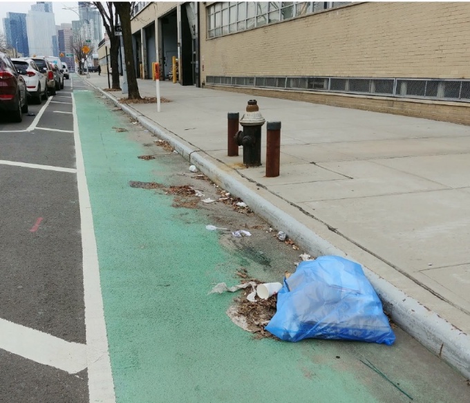 Litter seen on Skillman Avenue’s bike lane and sidewalk near 39th Street (Sunnyside Family Fun Bike Ride/Transportation Alternatives Queens Volunteer Committee)