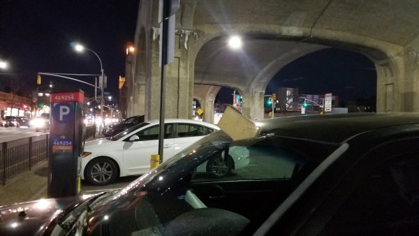 A tile wedged in the windshield of a car parked under the 7 line viaduct, seen at around 6:30 p.m. on Jan. 10. (Photo courtesy of Vitali Ogorodnikov)