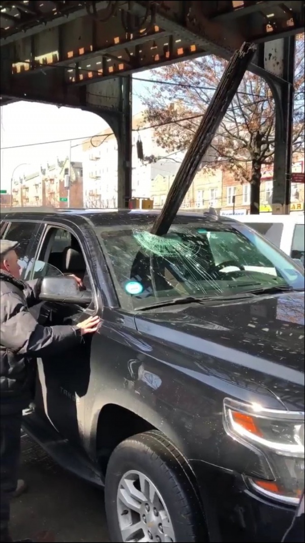 Debris that fell from the 7 train structure to a car below at 62nd Street (via Council Member Jimmy Van Bramer on Twitter)