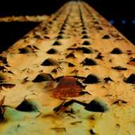 In the waiting area near the LIRR ticketing office are a few rows of benches, though people rarely sit down on them; there too is mineral built-up from water dripping through the ceiling which also sports peeling chips of paint that resembles mud drying in a desert.