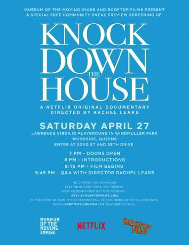 “Knock Down the House,” the award-winning film that follows the freshman congresswoman’s victorious underdog campaign, will be screened at Windmuller Park on Saturday night at 8:15. The event is free and open to the public.