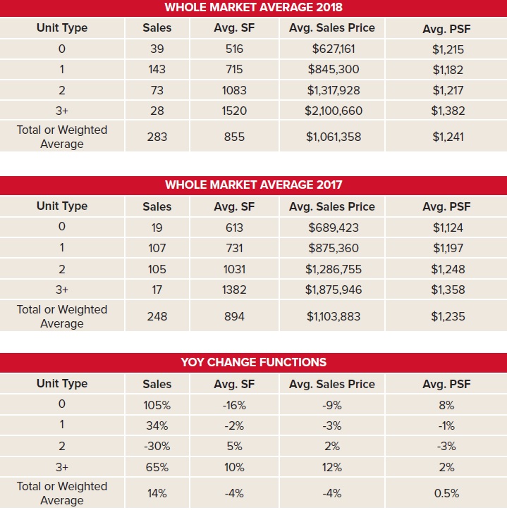 The prices paid for two and three-plus bedrooms continue to show their resilience. The average price for a 2 bedroom in 2018 was $1.3 million, up 5 percent from 2017. Units with three bedrooms or more sold on average for $2.1 million, up 12 percent from 2017.