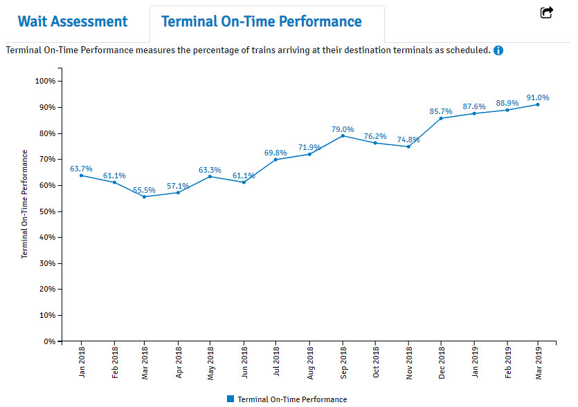 The agency said that on-time performance numbers have gone from 75 percent the month before CBTC was installed to 91 percent in March 2019. A year ago, in March 2018, on-time performance was at 56 percent.