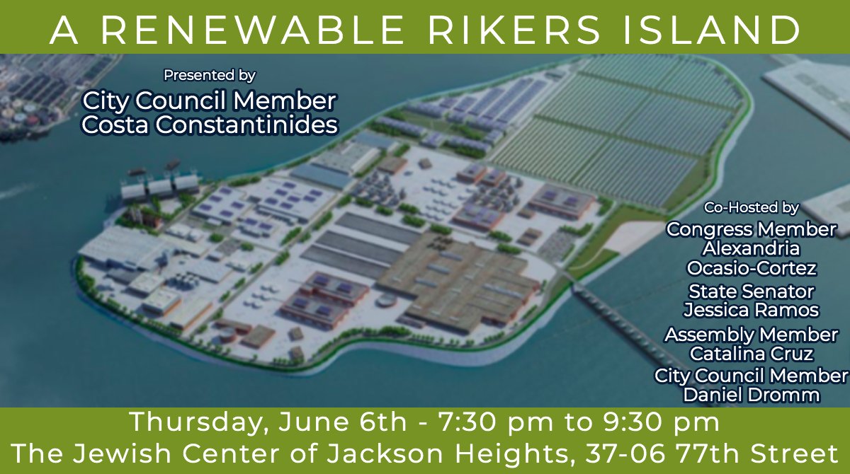 Council Member Costa Constantinides is holding the event June 6 where he will discuss his plan of utilizing one-quarter of the 413-acre island to create sustainable energy. The forum will take place at the Jackson Heights Jewish Center, located at 37-06 77th St., from 6:30 p.m. to 8:30 p.m.