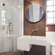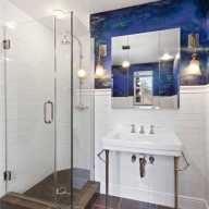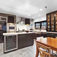 As you walk into the home, the foyer holds a half bathroom that’s decked out in mirrors. As you explore the first floor, to the left you’ll find a spacious living room with a fireplace, lots of windows and access to the yard. To the right, you’ll find an eat-in kitchen with a dining area, state-of-the-art appliances and a wine fridge.